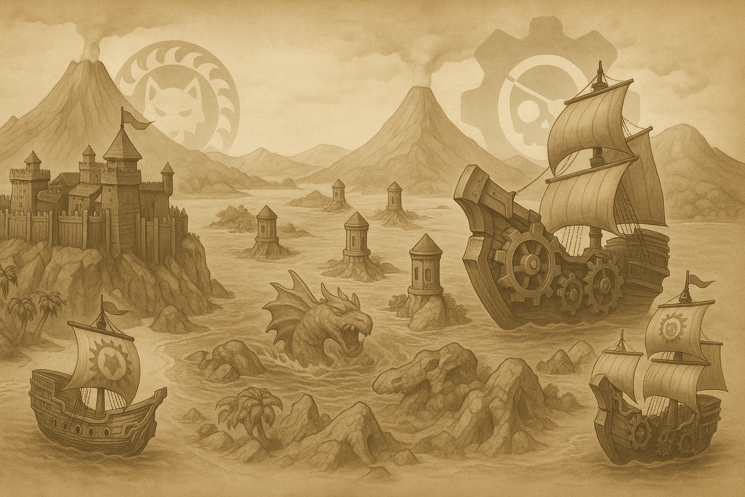 The Goldcoves lie divided by fate and steel. On one side, the ancient timber walls of Splinterhaven, stronghold of the Sea Wolves; on the other, the gear‑forged battlements of Ironreef, home to the Iron Corsairs. Between them lie six rune‑charged towers, each a fulcrum of the Leviathan's Pact. Pirates from both factions vie in eternal combat to capture those towers and tip the balance of the sea in their faction's favor.